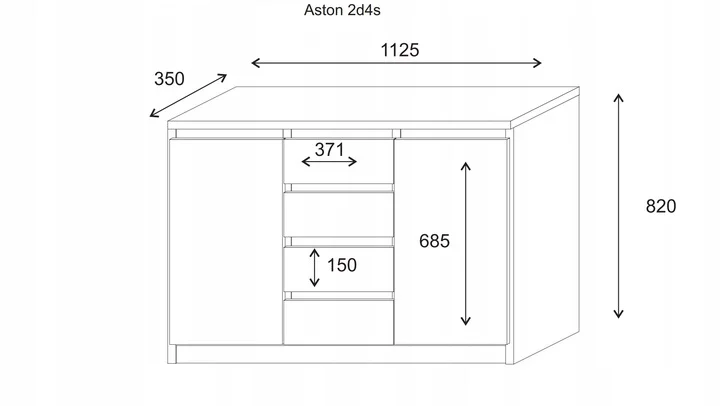 W środku znajdziesz cztery pojemne szuflady oraz dwie szafki z półkami, które zapewniają mnóstwo miejsca na przechowywanie – dokumentów, ubrań czy domowych drobiazgów. Dzięki temu z łatwością utrzymasz porządek w swoim wnętrzu.