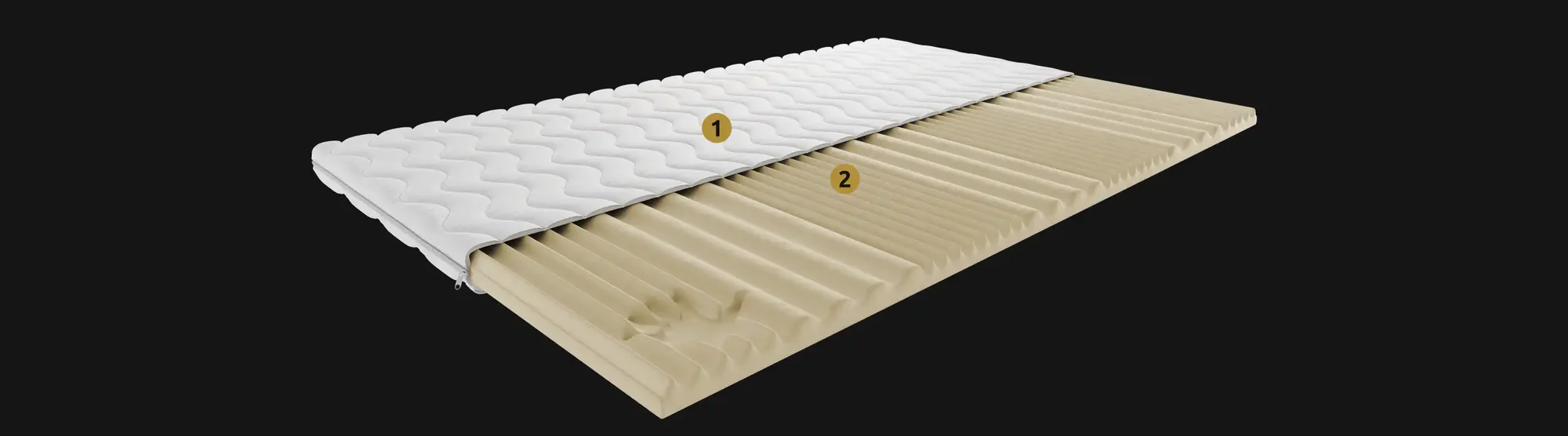 Topper wykonany z pianki termoelastycznej VISCO, znanej również jako memory foam. Jego unikalną cechą jest 7-strefowa konstrukcja, która zapewnia zróżnicowane podparcie dla poszczególnych partii ciała, dostosowując się do anatomicznej budowy użytkownika.
