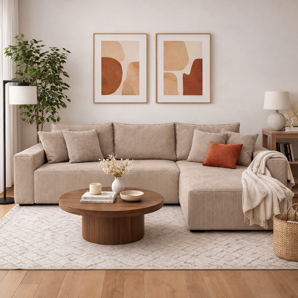 - Tył narożnika sztruksowego obity w wybranym wariancie kolorystycznym pozwala na umieszczenie mebla nawet pośrodku salonu.