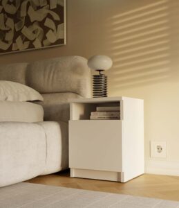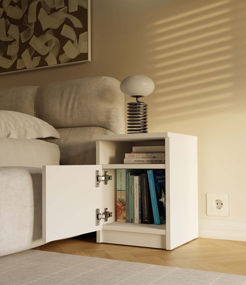 - Półka otwarta oraz zamknięta za drzwiami: idealne do przechowywania najpotrzebniejszych rzeczy, takich jak telefon, ładowarka, książka czy okulary.