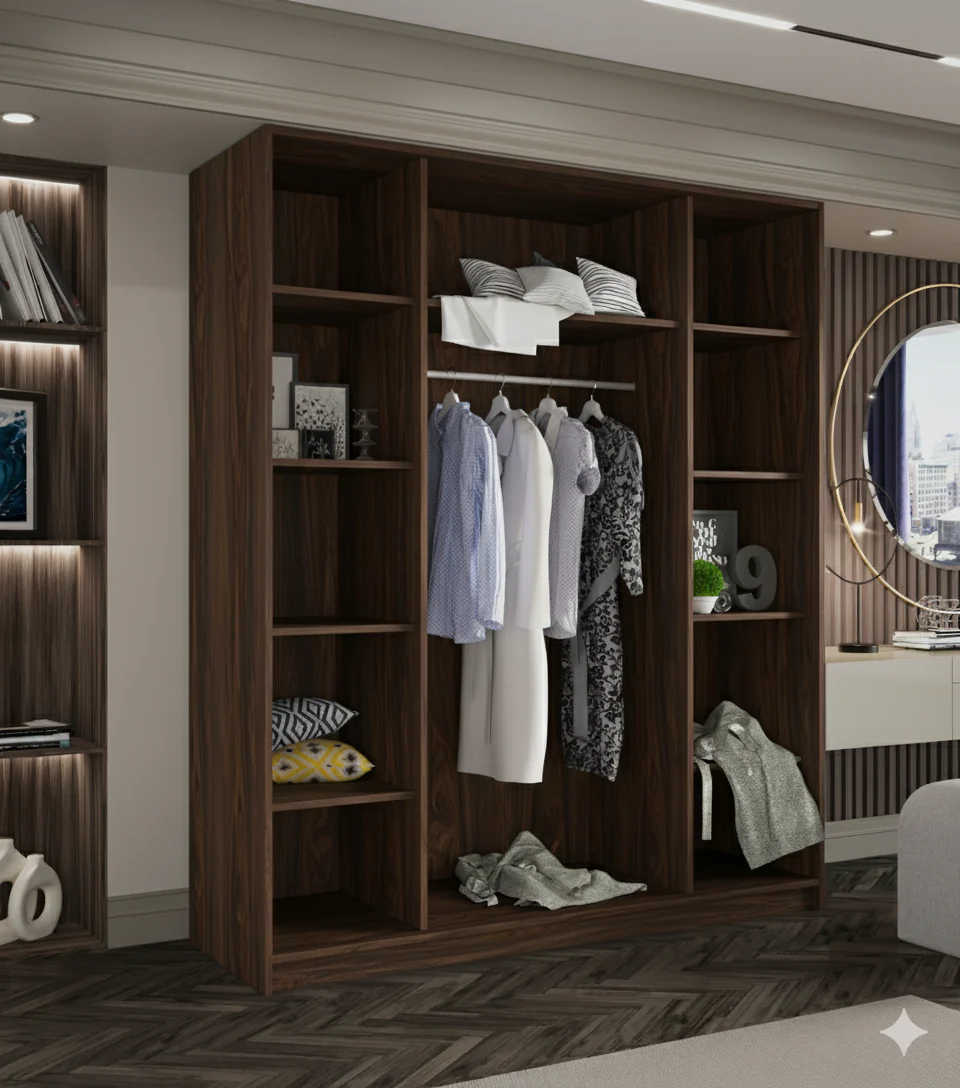 Praktyczne wnętrze podzielone jest na półki na przedmioty/ubrania oraz wieszaki. Drążki do wieszania zawarte są w cenie.