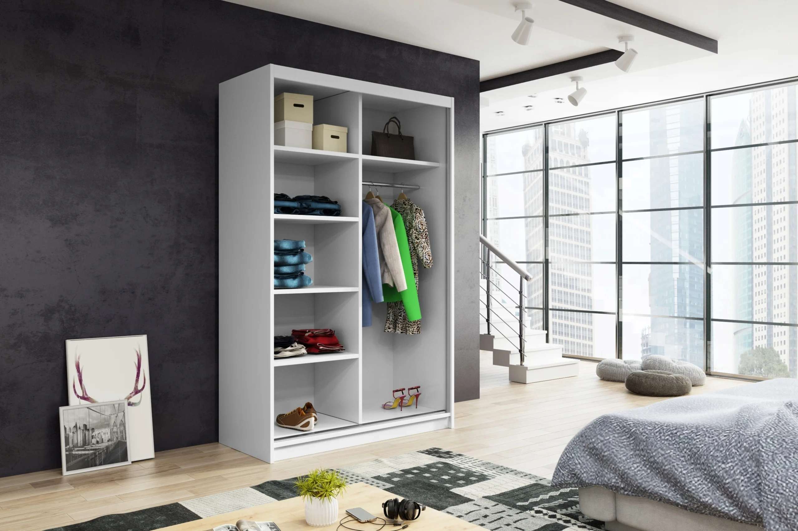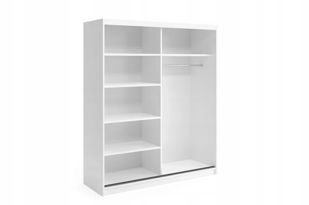 Praktyczne wnętrze szafy przesuwnej podzielone jest na półki na przedmioty/ubrania oraz wieszaki.