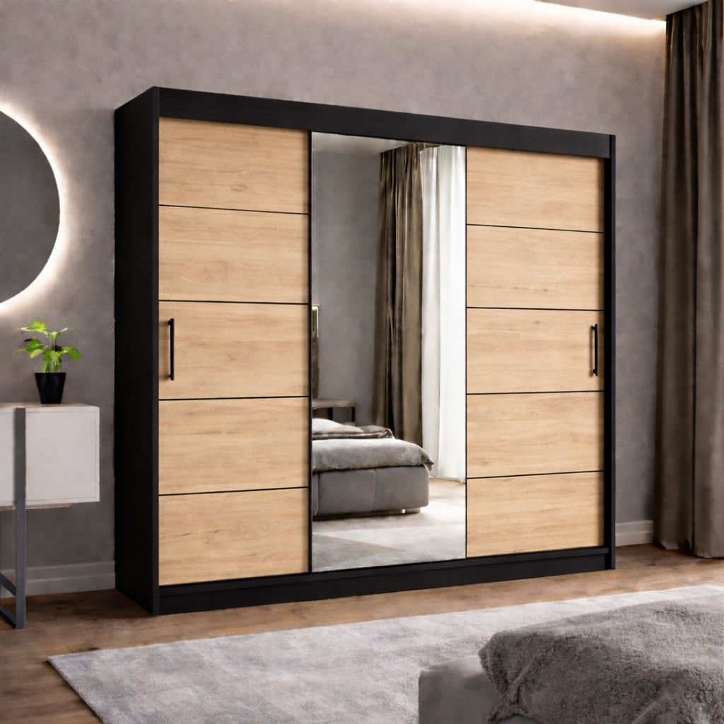 Pojemna szafa trzydrzwiowa RIO-3 180 z dużym lustrem oraz z systemem drzwi przesuwnych.